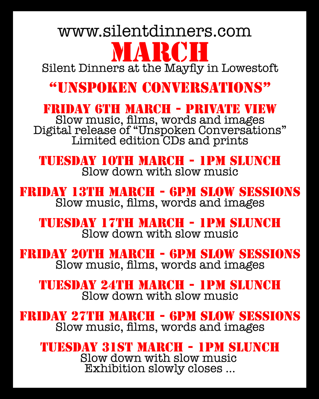 March Exhibition: Silent Dinners Monday 2 March 2026 10:00 Tuesday 31 March 2026 14:30 Google Calendar ICS